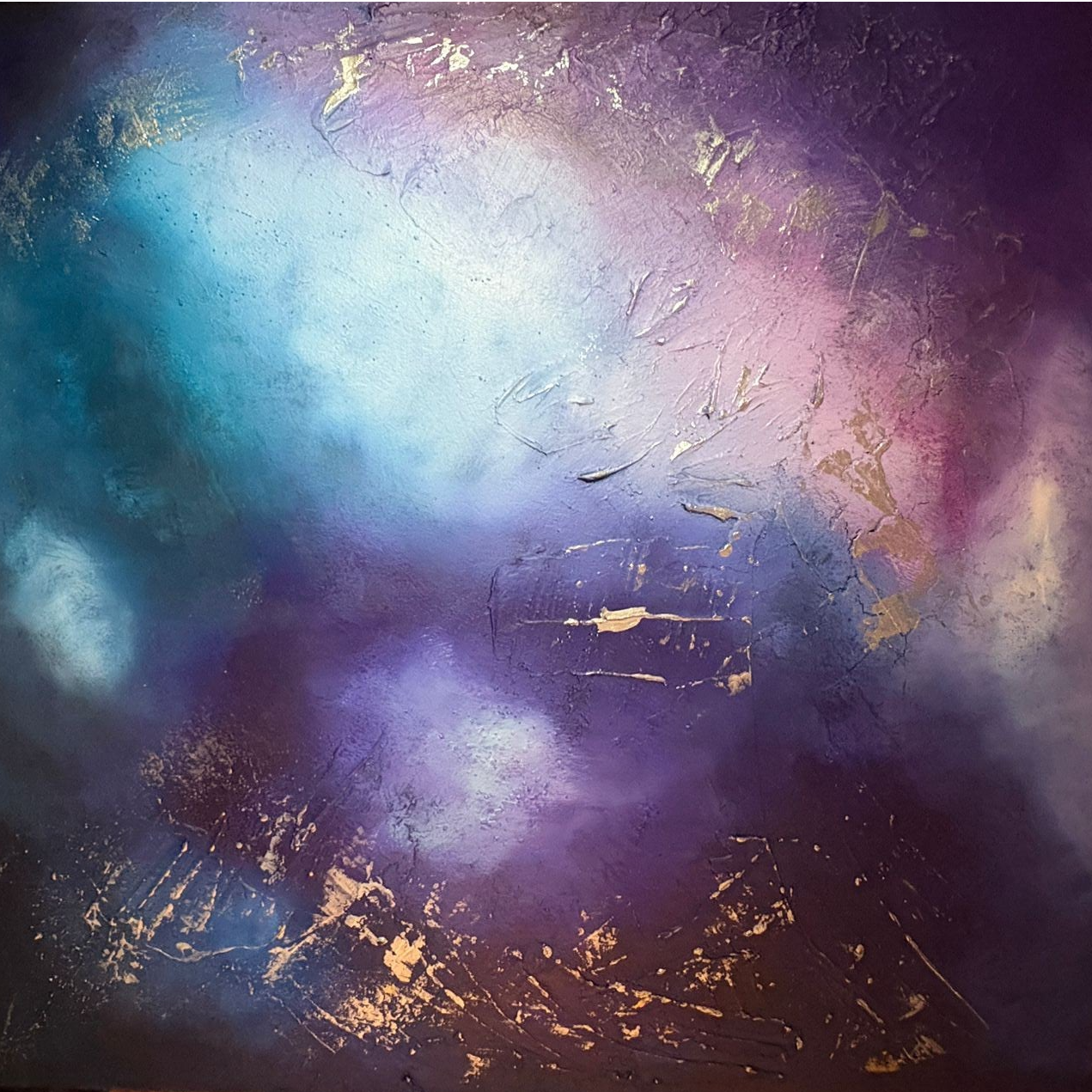 A deep cosmic swirl of violet, sapphire, and silver mist drifts across the canvas like a celestial breath. Shimmering textures suggest star-born clouds folding inward, cradling space in quiet reverence. This piece speaks of wonder, stillness, and the beauty found in the vast unknown.